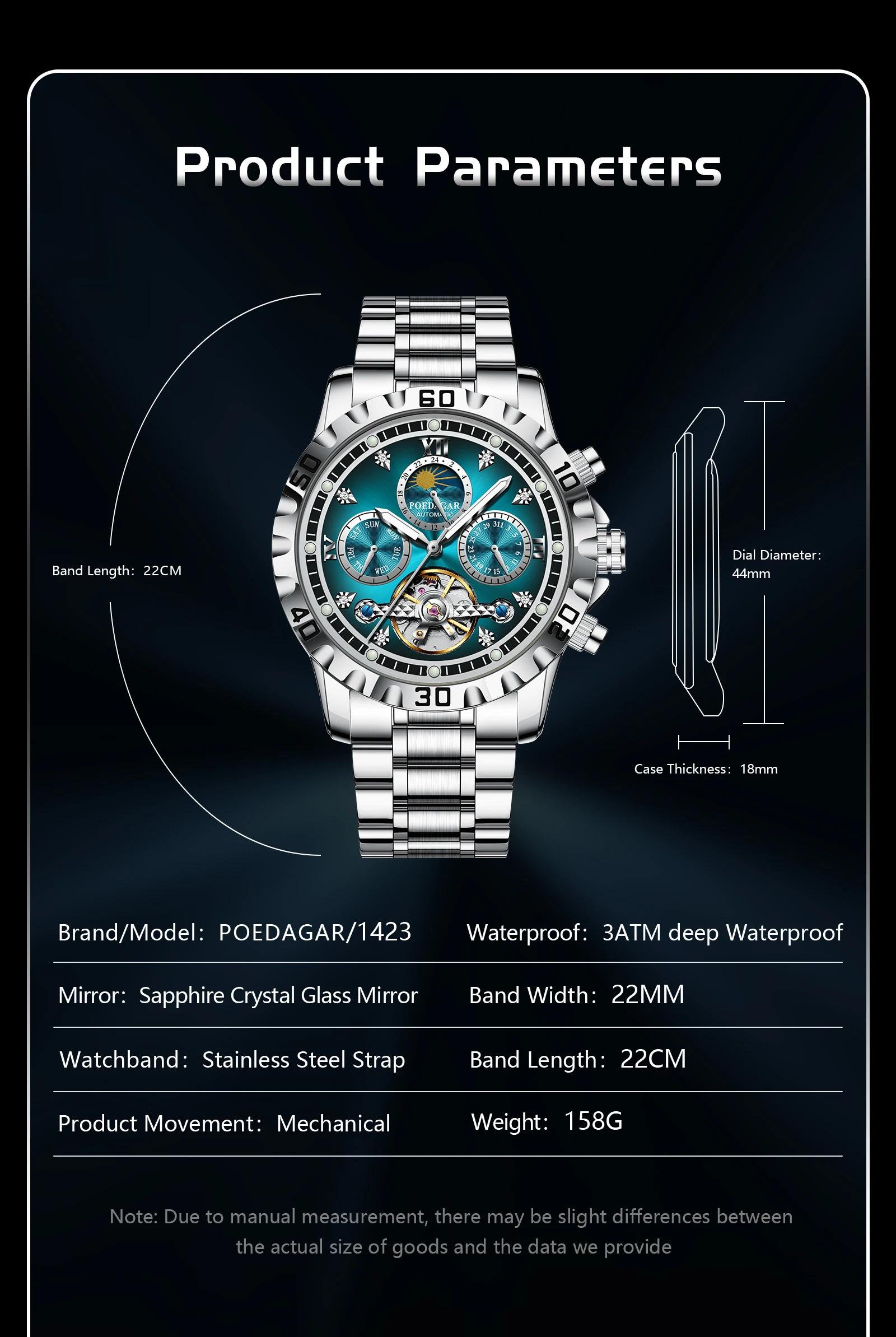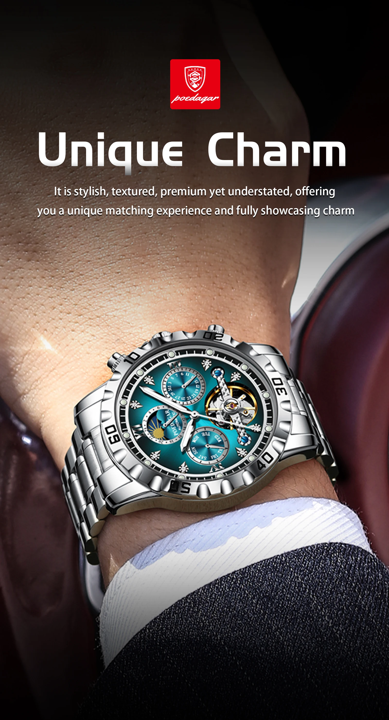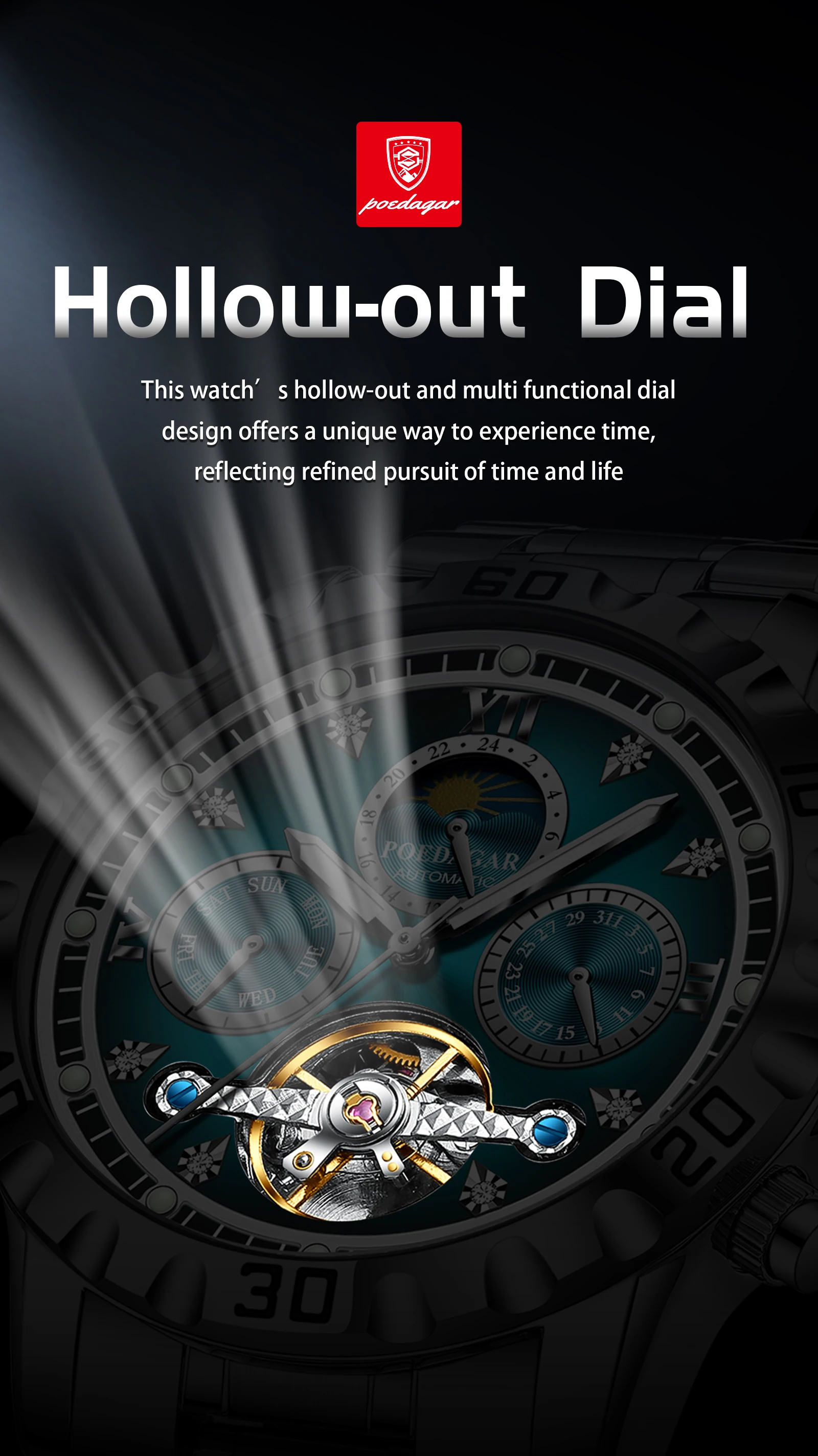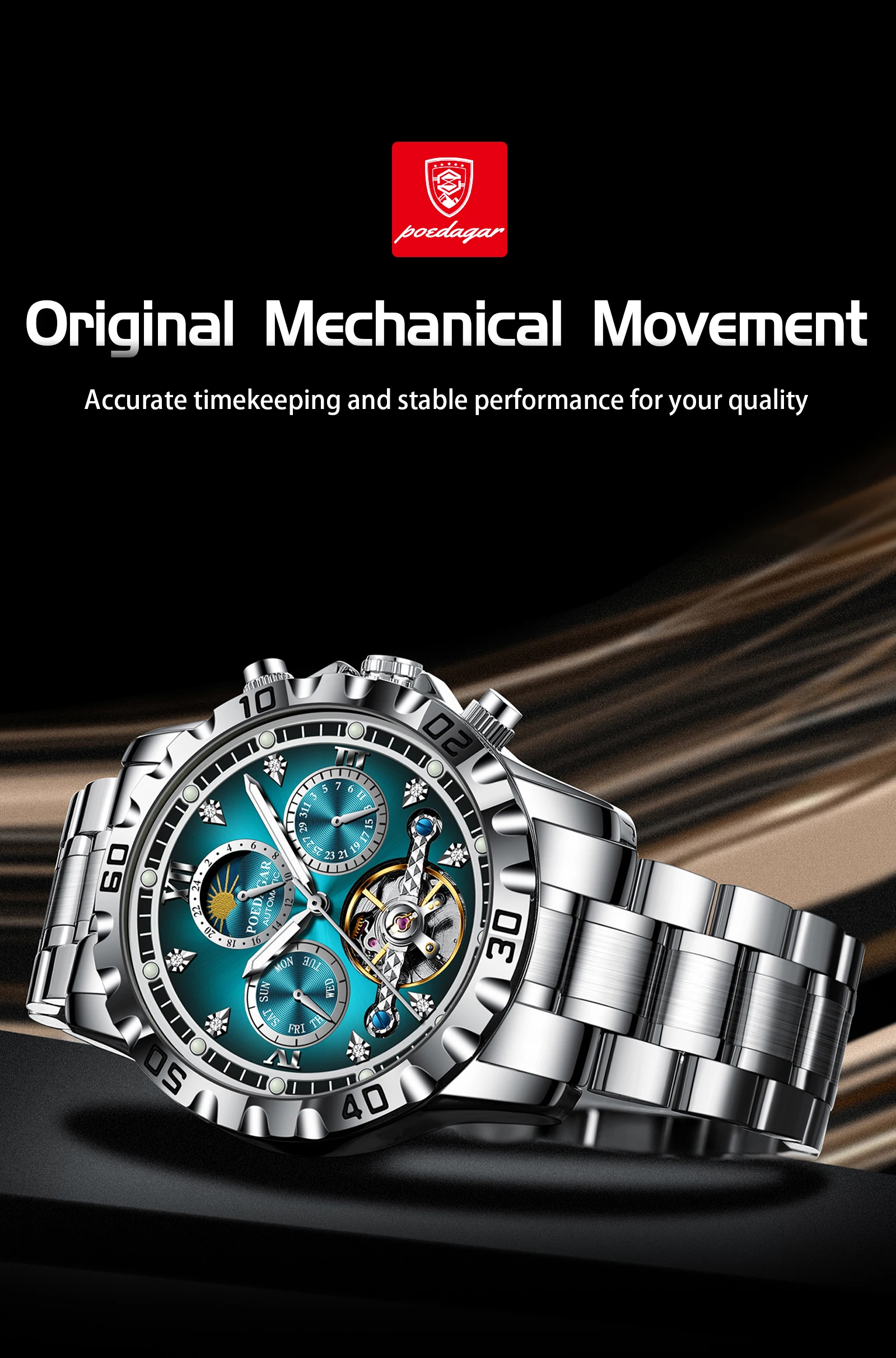 POEDAGAR Military Luxury Men Clock Mechanical Waterproof Man Watch Hollow Tourbillon Automatic Stainless Steel Men's Watches+Box