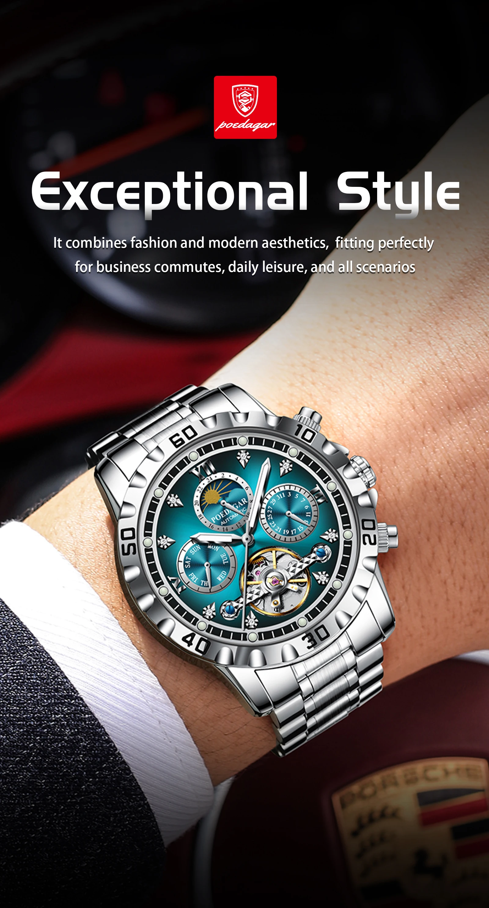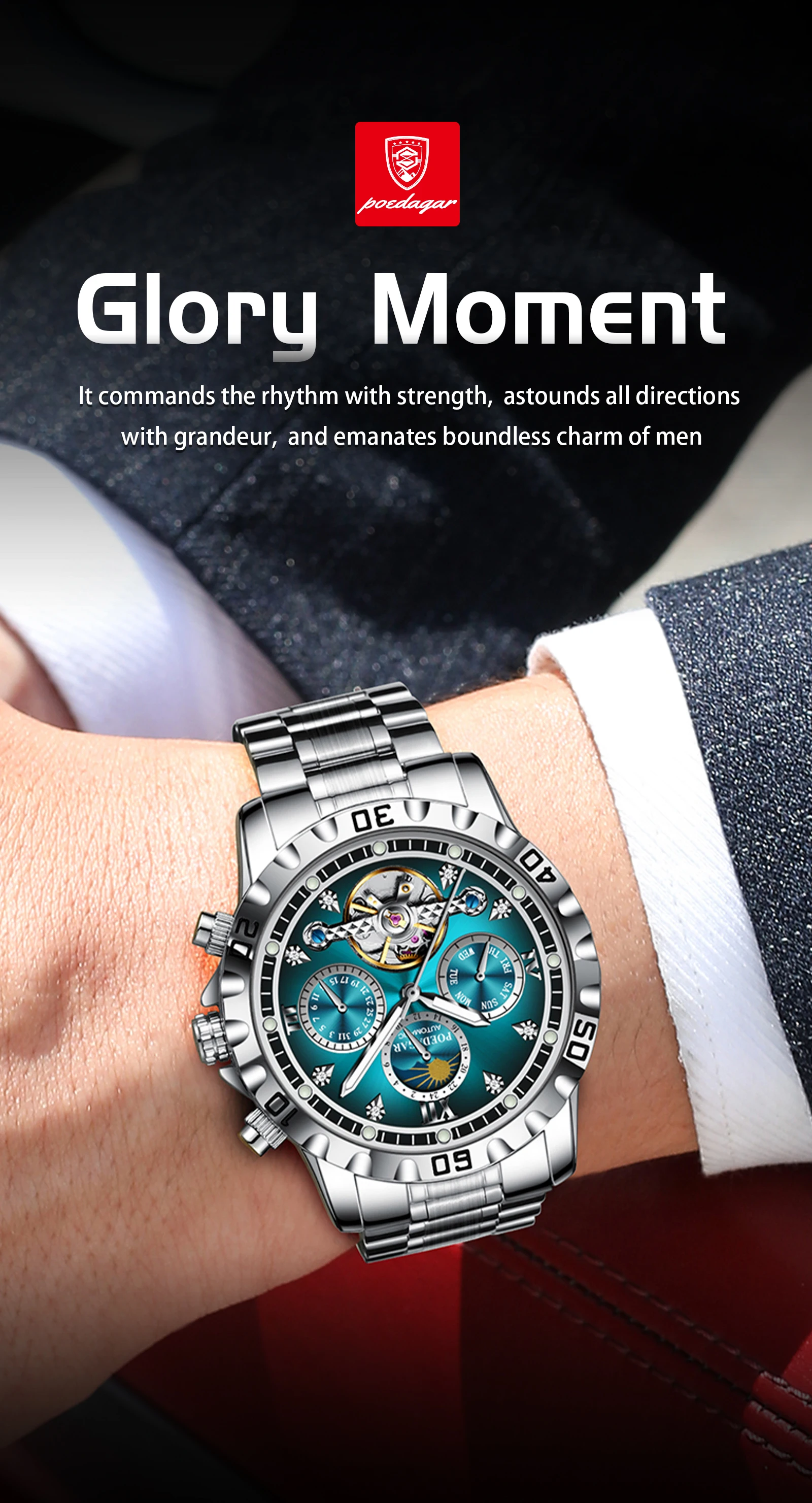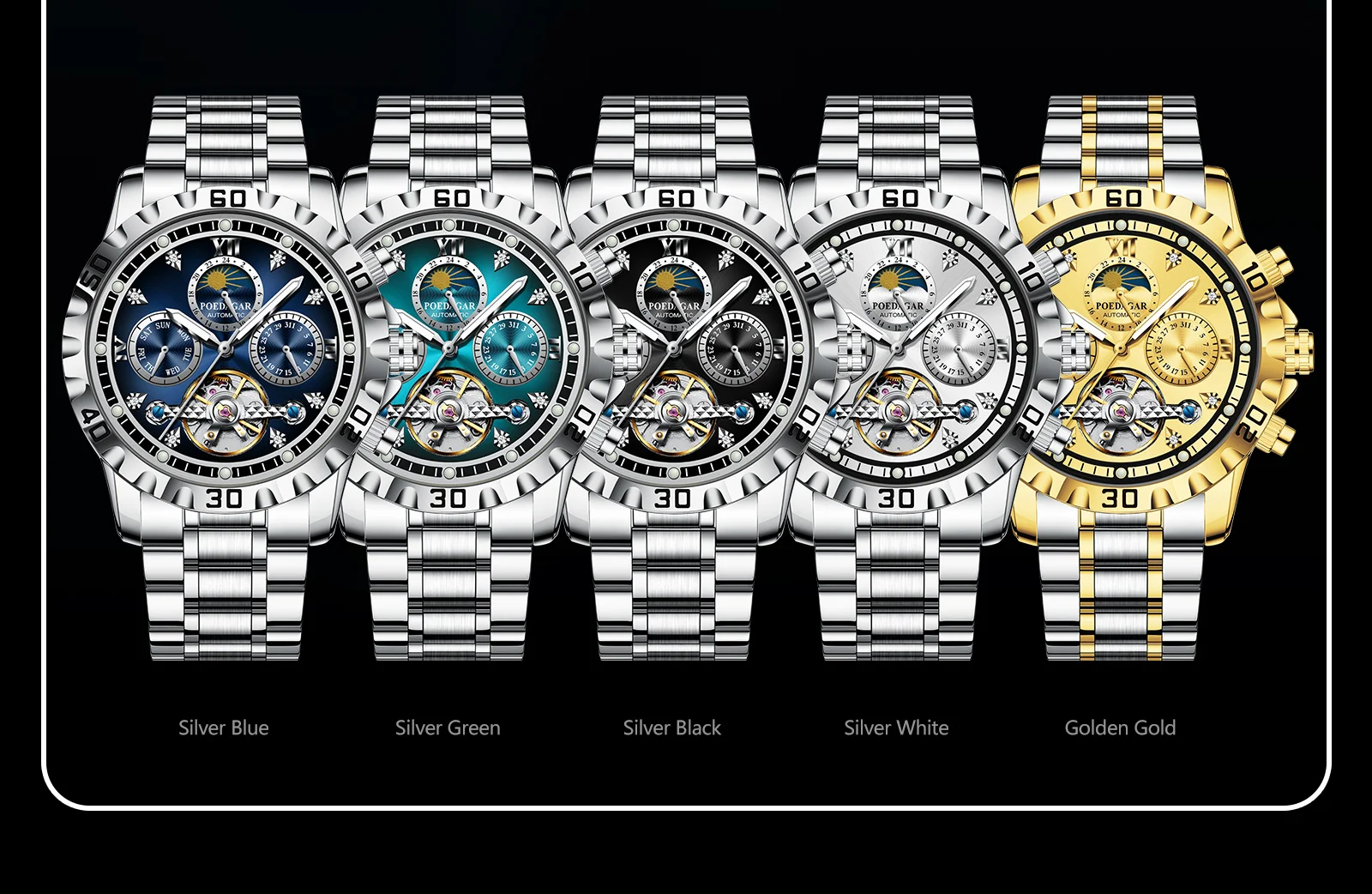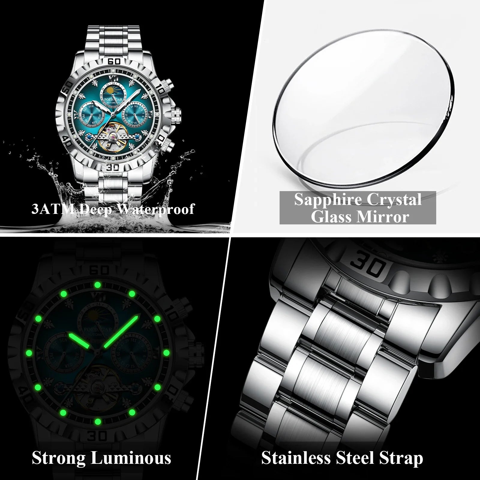 POEDAGAR Military Luxury Men Clock Mechanical Waterproof Man Watch Hollow Tourbillon Automatic Stainless Steel Men's Watches+Box