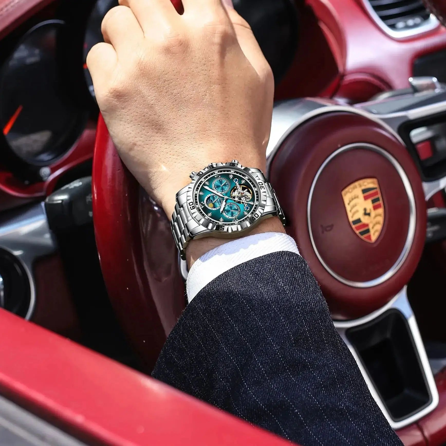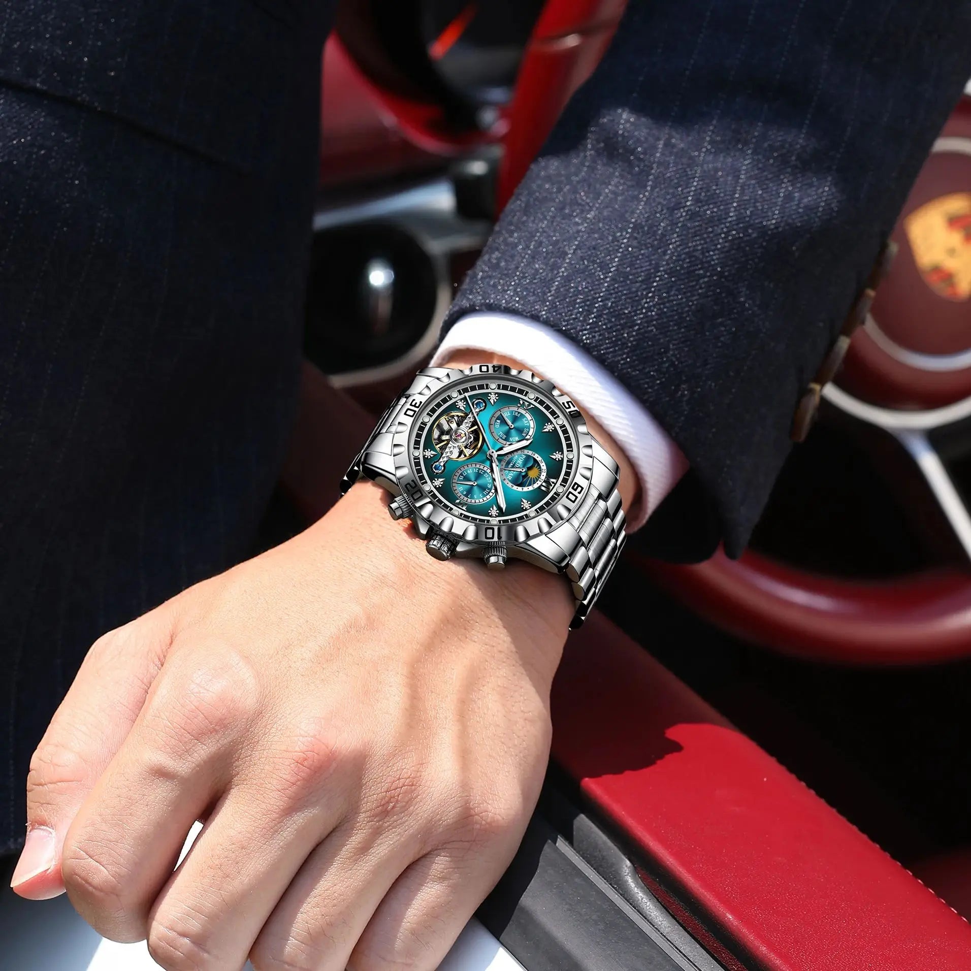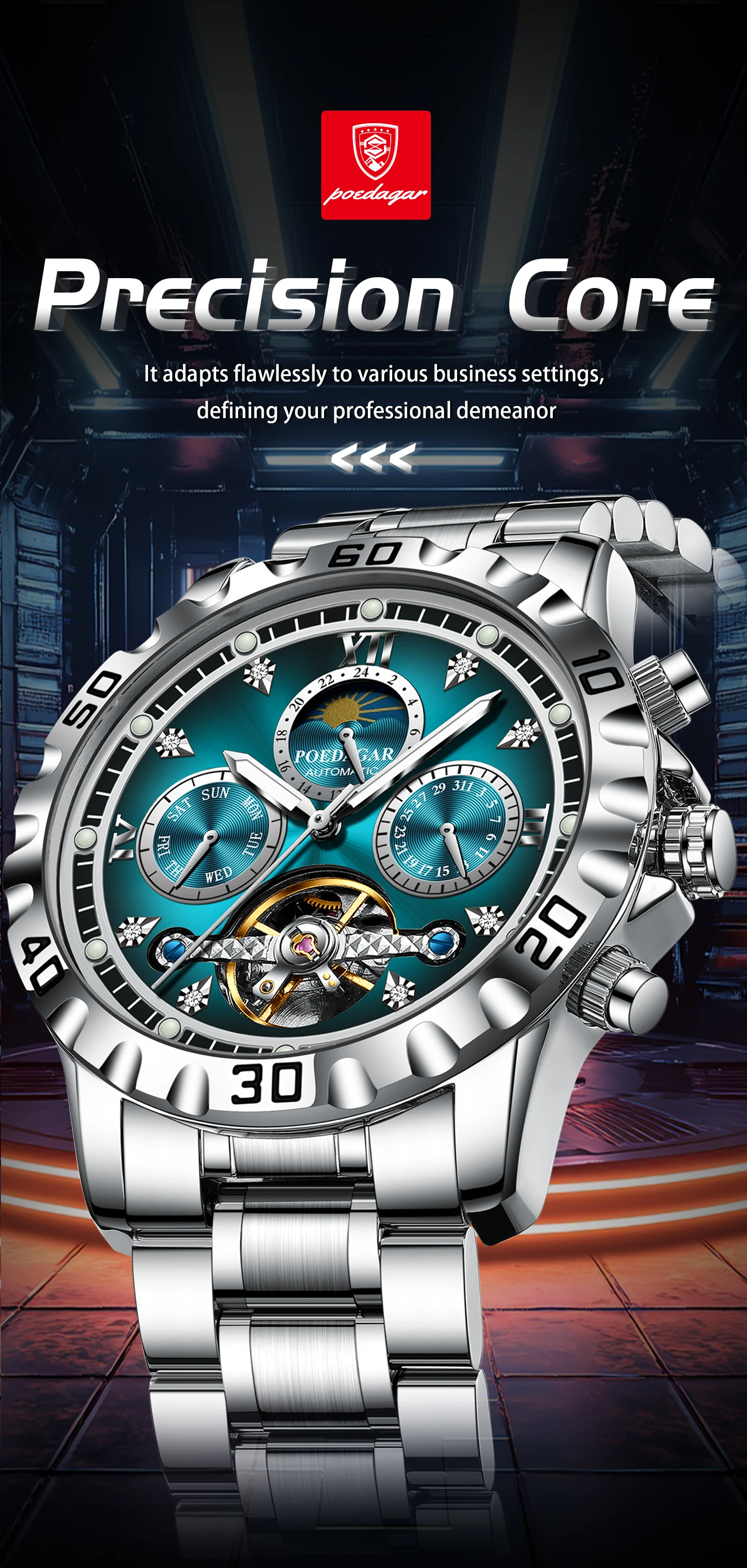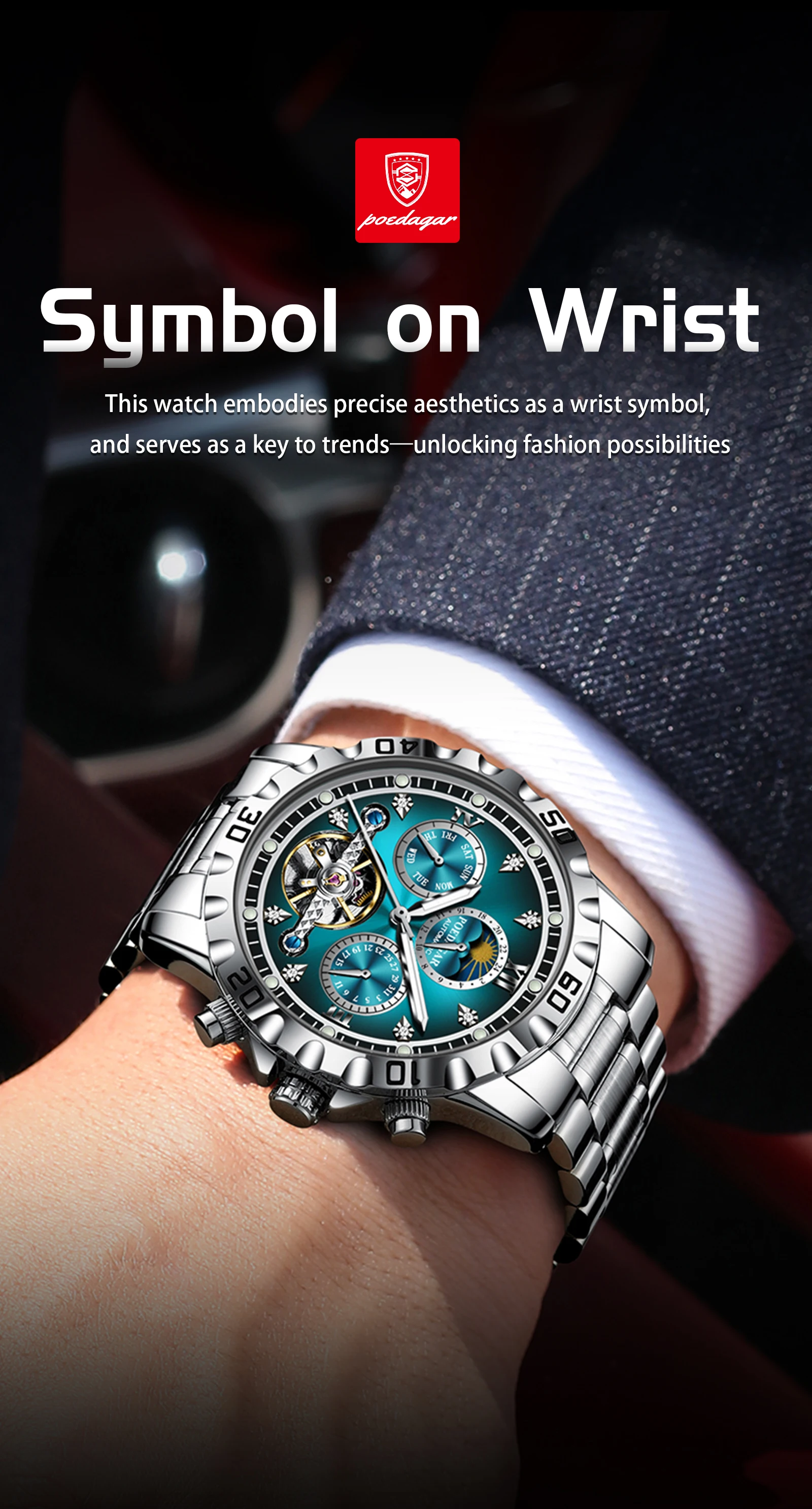 POEDAGAR Military Luxury Men Clock Mechanical Waterproof Man Watch Hollow Tourbillon Automatic Stainless Steel Men's Watches+Box